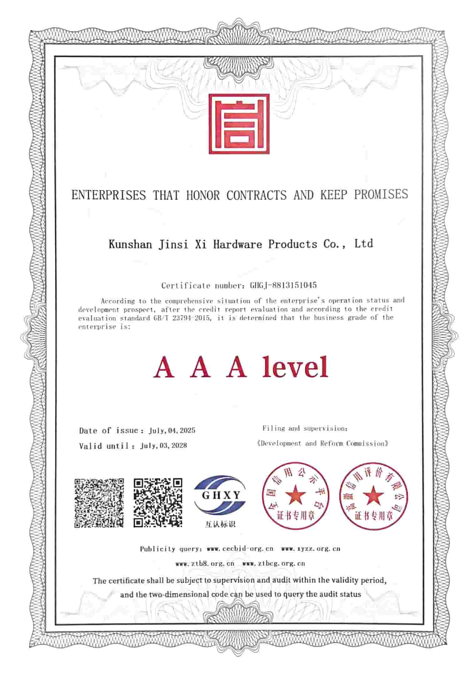 КуншанJINSIXIMetalware Co., Ltd. официјално ја доби титулата „Претпријатија на ниво на ААА кои почитуваат договори и ги исполнуваат ветувањата“. JINSIXI отсекогаш се придржувала до деловната филозофија на „единство и соработка, трудољубивост, стремеж кон извонредност и совршенство“, работи со интегритет, обезбедувајќи им на клиентите висококвалитетни услуги и на крајот постигнувајќи „совршено исполнување“.